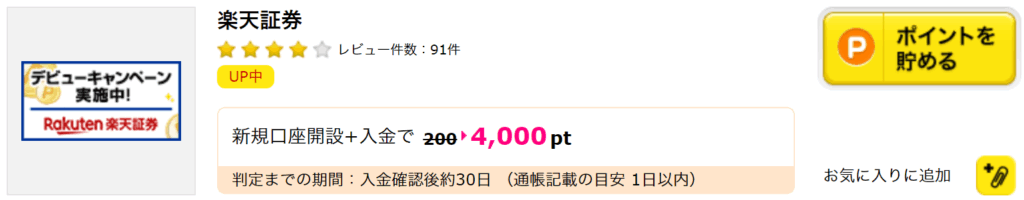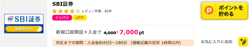 SBI証券の口座も追加で開設しておいてもいいですね。この二つ(楽天証券とSBI証券)はネット社会における証券会社の双璧です。SBIの方はポイント付与の条件が楽天よりもすこし高くなるので注意してください。こちらもハピタスから申し込むことができます。