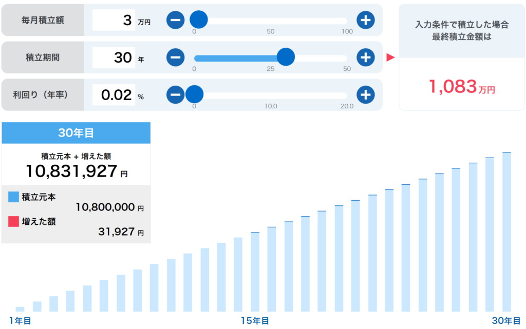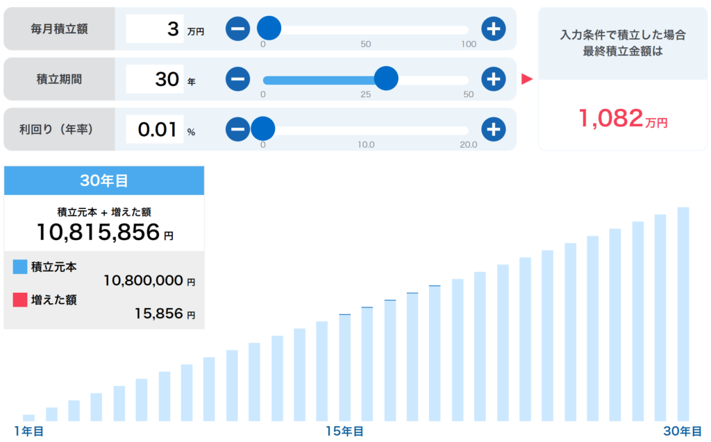 いまは2022年ですが、銀行預金の金利は同じままです。今回は、シミュレーション画像を一緒に見ていくことにしましょう。一つ目のシミュレーションはこちらです。毎月3万円ずつを積み立てていきます。