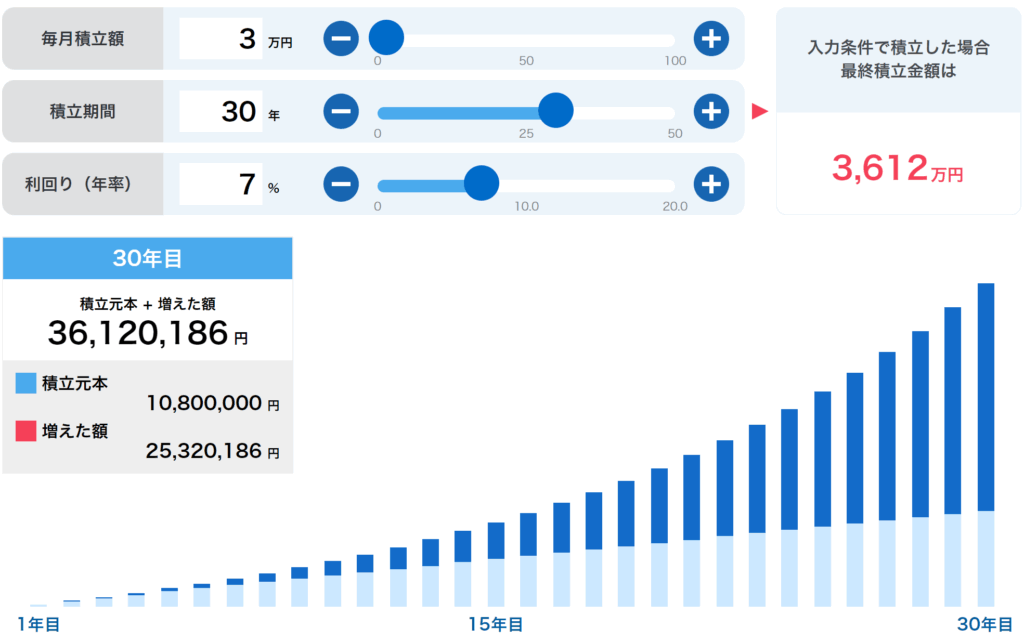 ※ 本シミュレーションは1ヵ月に1回再投資した複利で計算しています。また、税金・手数料・費用等を考慮しておりません。以下からも同様です。
