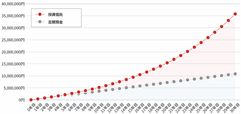 約3,612万円です。普通預金や定期預金と比べて3倍以上の差がついていることが分かりますよね。銀行預金だと、この差分をまるまる逃していると言ってもいいかもしれません。実際の数字を見ると、その歴然さを感じることができると思います。