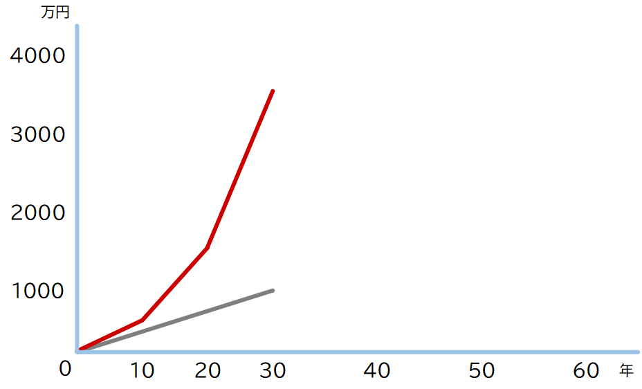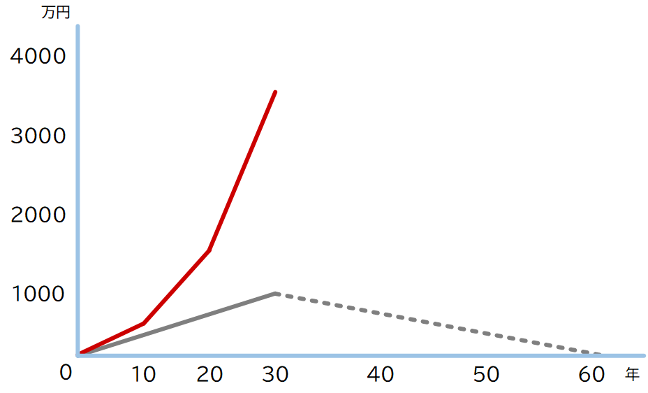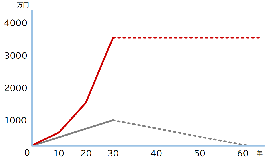 はじめの30年間で積み立ては終了したものとします。先ほどにならって35歳でスタートさせたとすると、65歳まで積み立てて、あとは資金の追加はしないということです。定年して、貯めたものを切り崩していくフェーズに転換するようなイメージですね。