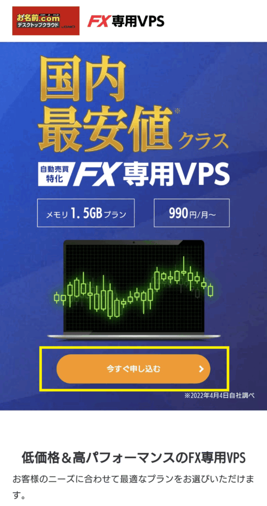 サービス名はFX専用VPS「お名前.comデスクトップクラウド」です。FXの自動売買に特化しており、EAの運用に最適化されていると謳われています。早速ボタンから飛んでみましょう。