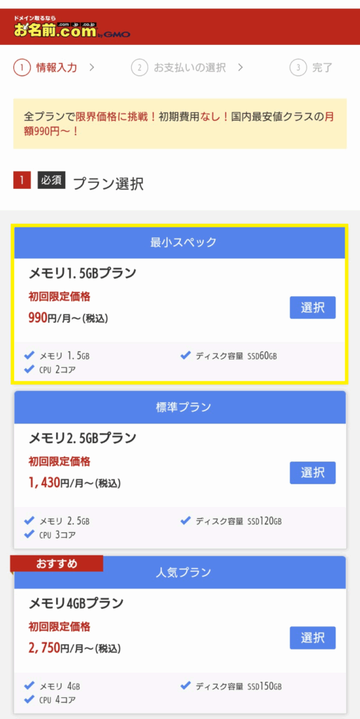 すると容量ごとのプラン選択画面が表示されます。今回は「メモリ1.5GBプラン」を選択してみましょう。