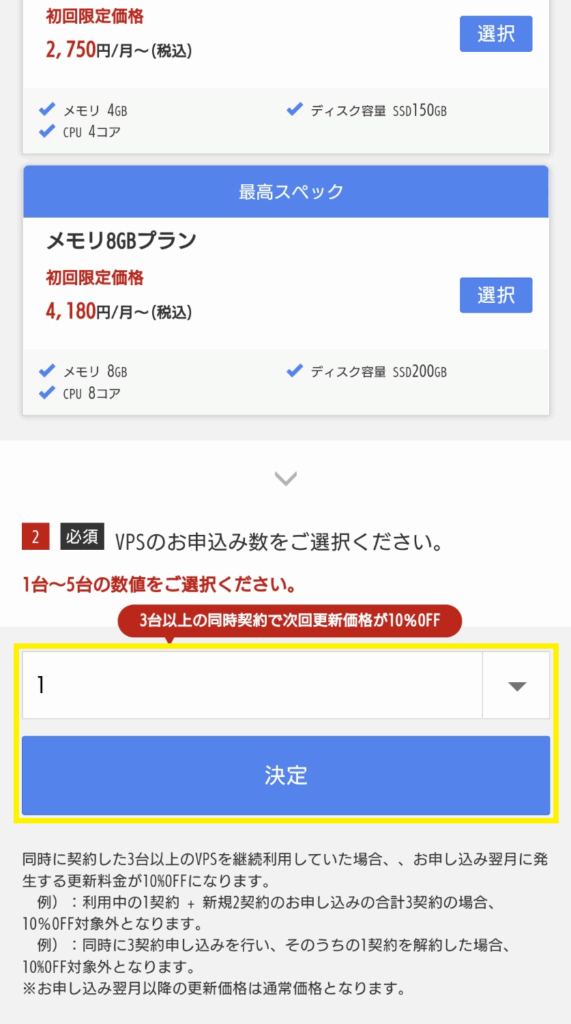 その後、申し込み台数を聞かれますので、「1」を選択します。