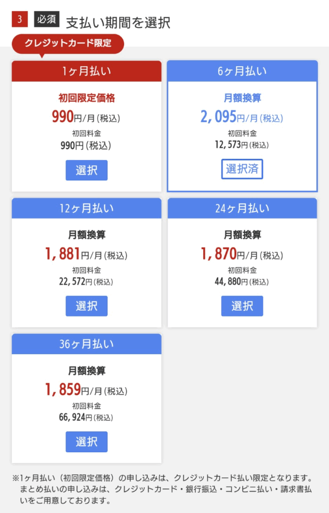そこまで進むと、支払い期間の選択画面が出てきます。長期間の方が割安にはなりますが、「1ヵ月」「6ヵ月」「12ヵ月」のいずれかを選んでおくのが良いでしょう。