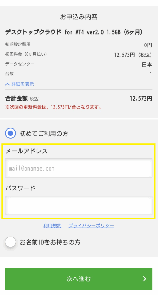 お使いのE-mailアドレス希望するパスワードを入力して次へ進み、必要事項の入力等をして手続きを完了させます。お名前.comのユーザーであればIDを入力するだけでOKです。