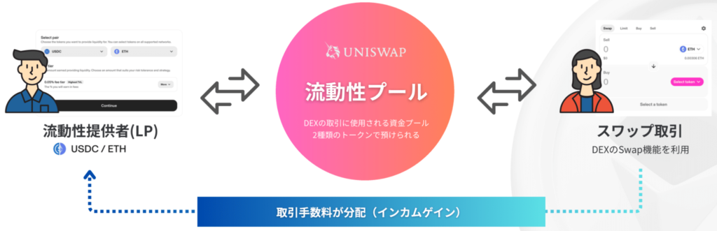 ウォレットコネクトによる接続なので、流動性は運営に預けられることなく、常にユーザー自身のウォレット内で管理されます。次のような流れですね。