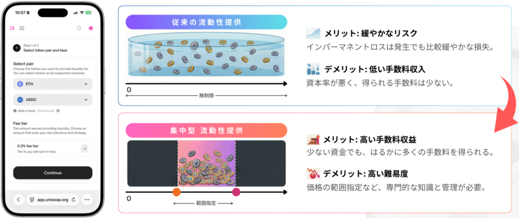 「集中型流動性提供モデル」では、流動性ボリュームをすべての価格帯に分散するのではなく、特定の価格範囲に集中して配置することで、実際に取引されている価格帯で優先的にプールが使用され、より多くの取引手数料を得る機会が生まれます。