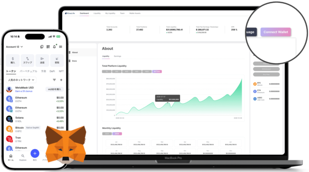EisaLife(イーサライフ) は、ブロックチェーンとスマートコントラクトを活用し、個人が自身のウォレットで流動性提供に参加できる分散型プラットフォームです。