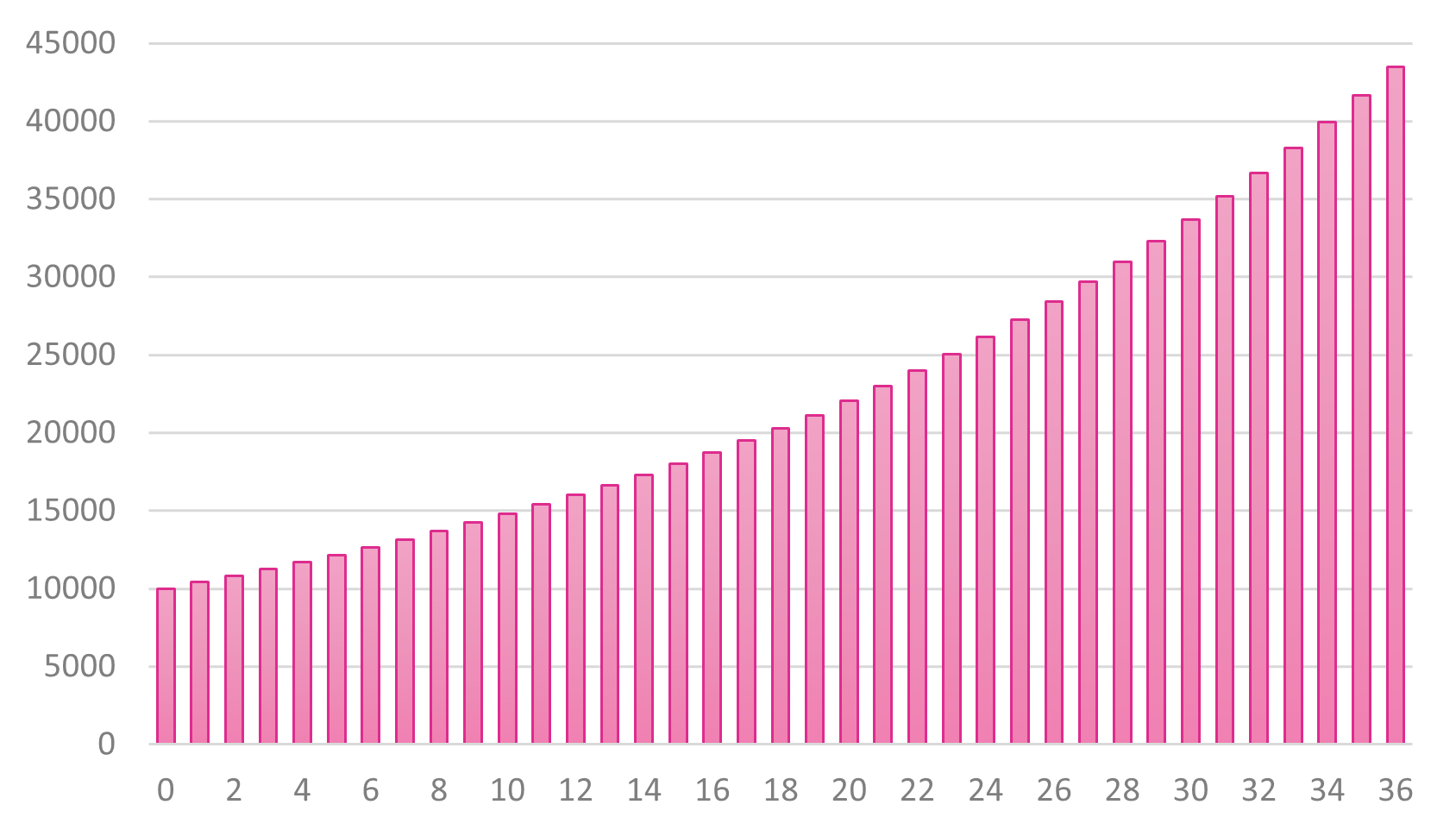 これも「100%」想定の場合で、$10,000(USDT)でスタートさせた場合のシミュレーションです。もちろん手数料収入なので、大きい月・小さい月はでてきますが、理論値として考えてください。3年後には43,000ドルに到達していることが分かると思います。