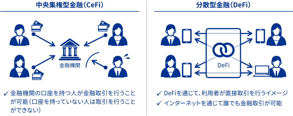 中央集権から非中央集権(=分散型)への移行という大きな流れは皆さんご承知のことと思いますので、まずは「DeFi」から。大きな特徴としては以下の3点ですね。