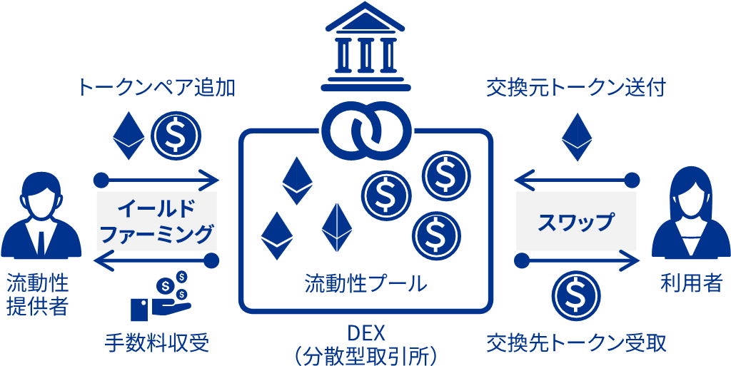この「あらかじめ預け入れておく」ことを「流動性を提供する」「流動性プールに預け入れる」と表現したりします。ちなみに、流動性プールにトークンを預け入れて手数料を得ることをイールドファーミング、トークンの交換を行うことをスワップと呼びます。この専門用語は覚えなくて大丈夫です。